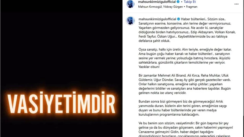 Sosyal medya hesabından paylaşımlarda bulunan sanatçı Mahsun Kırmızıgül eleştirilerde bulunarak “Sanatçının eserine, konserine, alın terine değer verilmiyor. Yaşarken yok sayılıyoruz, öldüğümüzde hatırlanıyoruz” sözleriyle tepki gösterdi.
