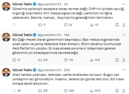Görevimiz psikolojik savaşlara cevap vermek değil; CHP’nin içindeki ayrılığı, kırgınlığı onarmaktır. Kirli medya algılarına değil, partimizin birliğine odaklandık. Sabırla, inançla… Geçmişimiz geleceğimizin teminatıdır.”